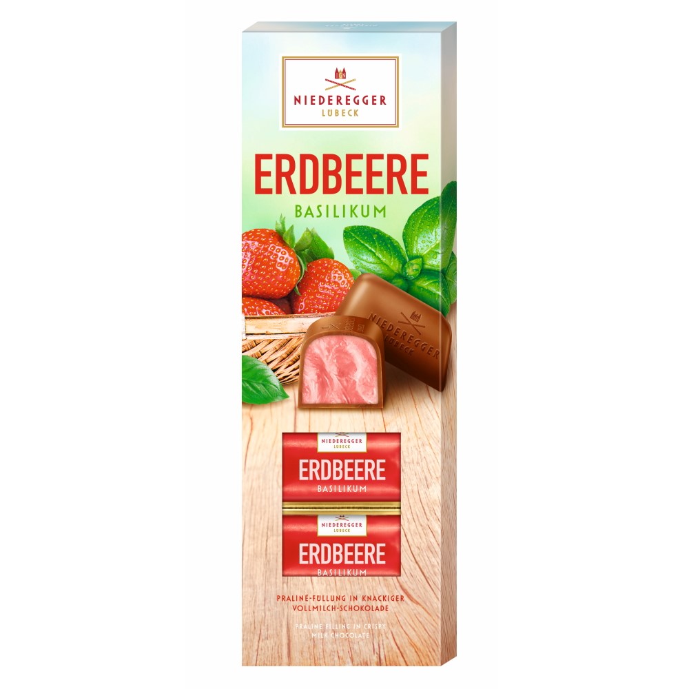 Состав: молочный шоколад 46% (сахар, какао-масло, сухое цельное молоко, какао-масса, эмульгатор: соевый лецитин, экстракт ванили), инвертный сахарный сироп, сахар, какао-масло, белый шоколад (сахар, какао-масло, сухое цельное молоко, эмульгатор: соевый лецитин, экстракт ванили), наполнитель из клубники 6,2% (клубничное пюре, клубничный сок, глюкозный сироп, сахар, инвертный сахарный сироп, натуральный ароматизатор, концентрат лимонного сока), базиликовая паста 4,9% (сахар, вода, яблочный сок, базилик 5,0%, подкислитель: лимонная кислота, желирующий агент: пектин), полуобезжиренное сгущенное молоко, глюкозный сироп, натуральные ароматизаторы, увлажнитель: инвертаза, пищевой краситель: порошок свеклы (мальтодекстрин, свекла), подкислитель: L(+)-винная кислота. Может содержать следы орехов и молока. Содержание сухих веществ какао в молочном шоколаде: не менее 33%. Содержание сухих веществ молока в молочном шоколаде: не менее 14%. Не содержит ГМО. Пищевая ценность на 100 г. продукта: жиры - 26,8 г, из них насыщенные жирные кислоты - 16,5 г; углеводы - 59,3 г, из них сахара - 56 г; белки - 3,3 г; соль - 0,1 г. Энергетическая ценность на 100 г. продукта: 496 ккал / 2076 кДж. Хранить в сухом прохладном месте, при температуре +16 +18 C, отн. вл. 60-80%.