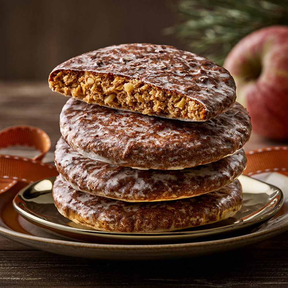 Состав: сахар, орехи 26% (фундук, миндаль, грецкие орехи), мука пшеничная, кусочки сушеных яблок 8%, инвертный сахарный сироп, сухой яичный белок, яйцо жидкое цельное, инжир сушеный, яичный порошок, увлажнитель: сорбит; картофельный крахмал, корица, цветочный мед, разрыхлитель: гидрокарбонат натрия; молочный белок, пшеничный белок, крахмал восковой кукурузы, соль, натуральные ароматизаторы.