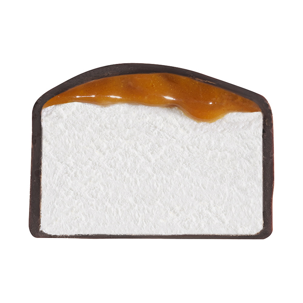 Состав: маршмеллоу (47 %) (глюкозно-фруктозный сироп, сахар, вода, декстроза, желатин, кукурузный крахмал, мед, молотый стручок ванили, регулятор кислотности: молочная кислота), темный шоколад (40%) (какао-масса, сахар, какао-масло, эмульгатор: соевый лецитин, натуральный ароматизатор: ваниль), соленая карамель (13%) (глюкозно-фруктозный сироп, сахар, сгущенное молоко, соленое сливочное масло, сухое цельное молоко, какао-масло, какао-масса, вода, соль, эмульгатор: соевый лецитин, натуральный ароматизатор: ваниль). Содержание сухих веществ какао в темном шоколаде: не менее 53%. Может содержать следы орехов, глютена, кунжута и яиц. Не содержит ГМО. Энергетическая ценность на 100 г: 1763 кДж / 421 ккал. Пищевая ценность на 100 г: жиры - 16 г, из них насыщенные жирные кислоты - 10 г; углеводы - 64 г, из них сахара - 62 г; белки - 3,8 г; соль - 0,11 г. Хранить в сухом прохладном месте, при t от +12 C...+18 C.