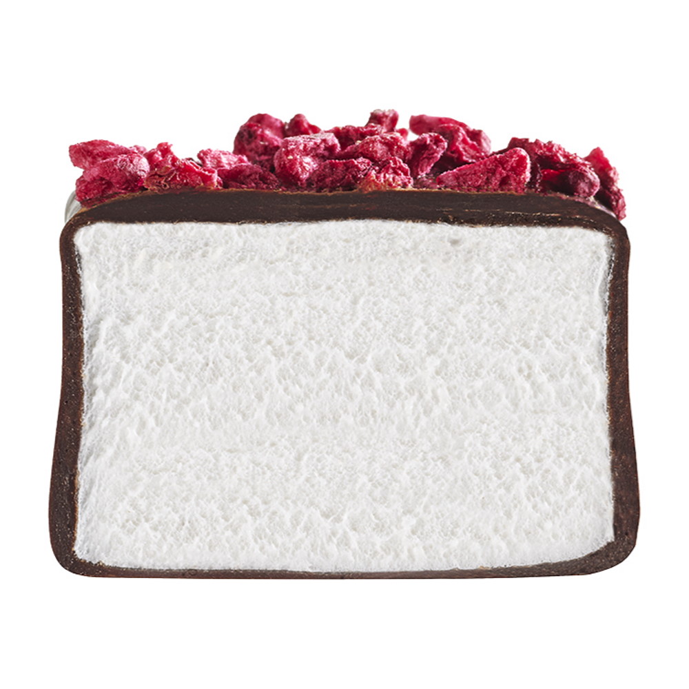 Состав: маршмеллоу (53,6%) (глюкозно-фруктозный сироп, сахар, вода, декстроза, желатин, кукурузный крахмал, мед, молотый стручок ванили, регулятор кислотности: молочная кислота), темный шоколад (45%) (какао-масса, сахар, какао-масло, молочный жир, эмульгатор: соевый лецитин, натуральный ароматизатор: ваниль), сублимированная малина (1,4%). Содержание сухих веществ какао в темном шоколаде: не менее 53%. Может содержать следы орехов, глютена, кунжута и яиц. Не содержит ГМО. Энергетическая ценность на 100 г: 1761 кДж / 418 ккал. Пищевая ценность на 100 г: жиры - 15 г, из них насыщенные жирные кислоты - 9,1 г; углеводы - 64 г, из них сахара - 63 г; белки - 3,6 г; соль - 0,02 г. Хранить в сухом прохладном месте, при t от +12 C...+18 C.